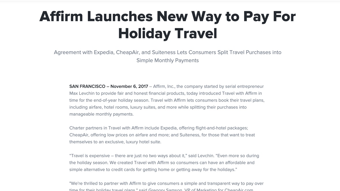 Affirm savings accounts are held with cross river bank member fdic. For a trip to qualify for affirm financing the following prerequisites must be met. The booking must be for a hotel or a bundle deal i e flights alone will not qualify travel must be deemed as leisure and not business the booking must be eligible for expedia.